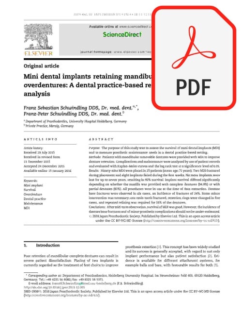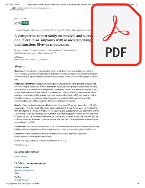 A 5-year study found that mini dental implants (MDIs) are a very successful treatment for older patients who have no teeth, with 100% success and survival rates. The MDIs, which were used to hold lower dentures, also led to better chewing ability and an increase in bite force over time.