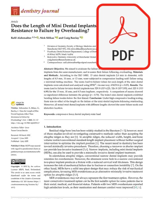 A lab study found that the length of mini dental implants (8.5 mm, 10 mm, or 13 mm) does not affect how well they resist failing under too much force. This suggests shorter mini implants can be safely used when a patient has less jawbone.